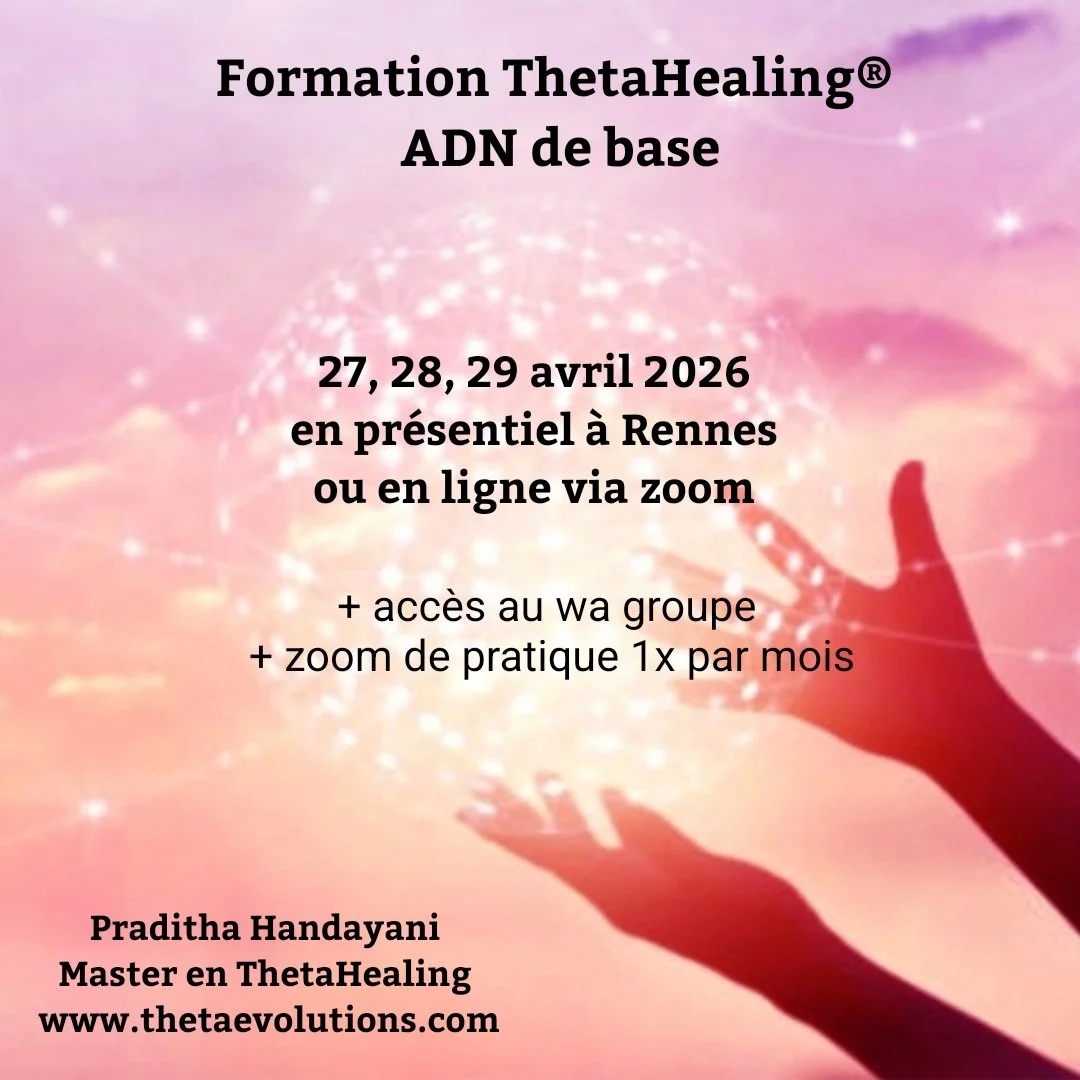 Pour apprendre la technique de ThetaHealing®, tout commence par la formation de 3 jours complets : ADN de base. Vous allez déjà beaucoup apprendre et pratiquer pendant ces 3 journées. Cela se poursuivre avec la formation ADN Avancé, Approfondissement et Toi & le Créateur. Ces 4 formations sont les bases pour être praticien de ThetaHealing et sont des prérequis pour accéder à d’autre formation de ThetaHealing plus avancé tels que Anatomie Intuitive.